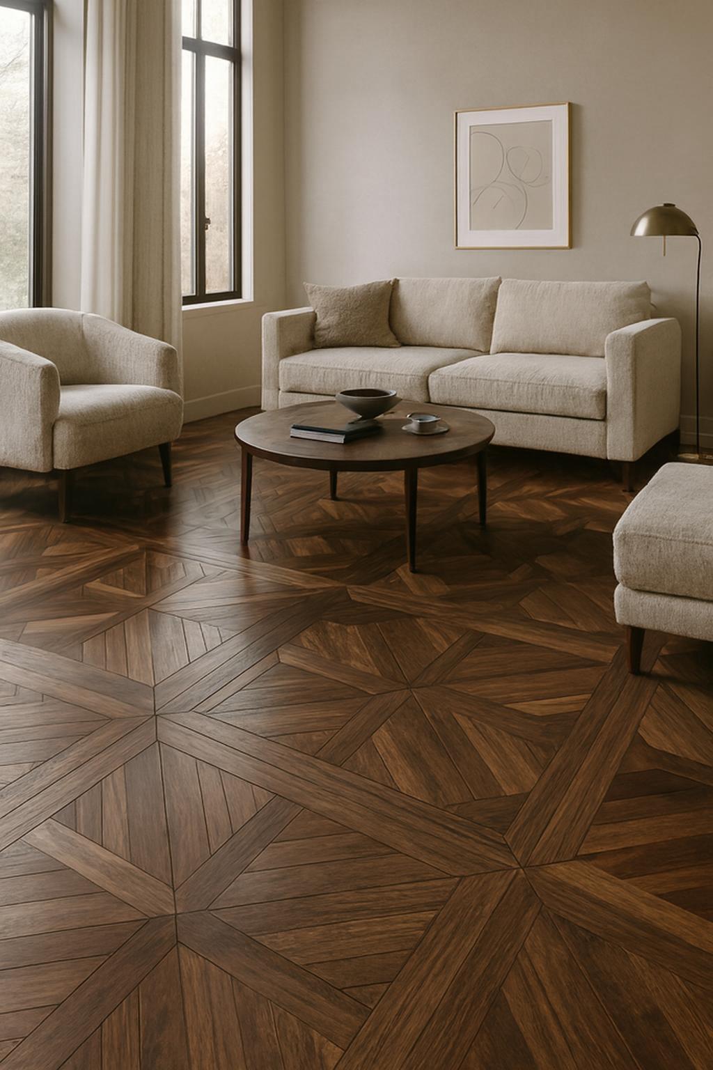 The Walnut panel from the Royal Collection is a distinguished wooden floor panel that exudes timeless sophistication. Its design features an intricate geometric pattern, composed of interlocking diagonal and straight segments that create a harmonious, symmetrical motif radiating from the centre. This elegant pattern is framed by a broad border, lending the panel a refined and classic appearance.